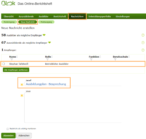Um besonders wichtige oder dringliche Nachrichten hervorzuheben, können Sie zudem einen Haken bei Nachricht als wichtig markieren setzen. Die Nachricht wird daraufhin im Posteingang des Empfängers rot hervorgehoben. Klicken Sie anschließend auf Absenden, um Ihre Nachricht/Antwort zu senden, oder Abbrechen, um sie zu verwerfen.