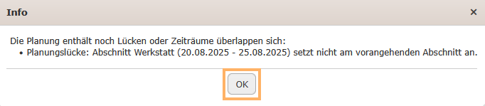 Wenn die Version eine Planungslücke oder -überschneidung enthält, erscheint ebenfalls eine entsprechende Hinweismeldung, die den Namen und Zeitraum des Abschnitts/der Abschnitte anzeigt, der/die nicht am vorangehenden Abschnitt ansetzt/ansetzen.