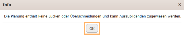 Wenn die Version keine Planungslücken oder -überschneidungen enthält, erscheint eine entsprechende Hinweismeldung, dass die Version nun Auszubildenden zugewiesen werden kann.