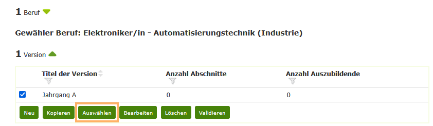 Nach der Auswahl des Berufs werden alle für diesen Beruf bestehenden Versionen sowie die Anzahl ihrer Abschnitte und Auszubildenden angezeigt. Die Spalten können ebenfalls gezielt nach Informationen gefiltert werden.