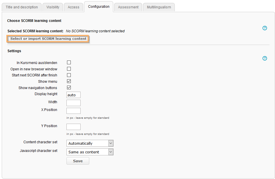 Settings in the configuration tab | In the Configuration tab, you can assign a SCORM package to your course element and specify various configuration options.