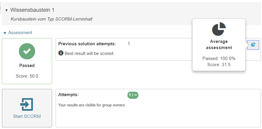 View assessment | The available assessment information for a course element SCORM will directly be displayed in the course area above the Start SCORM button after closing the SCORM.
