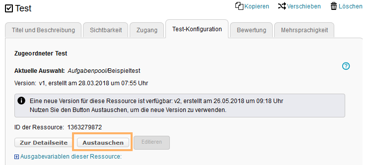 Klicken Sie auf den Button Austauschen, um die hinterlegte Test-Ressource durch eine andere Test-Ressource zu ersetzen. |