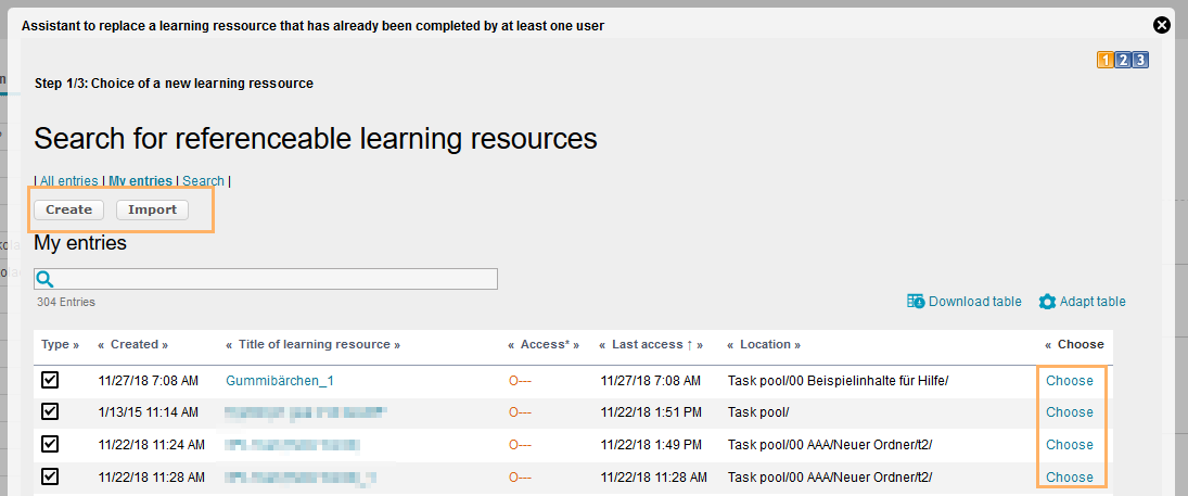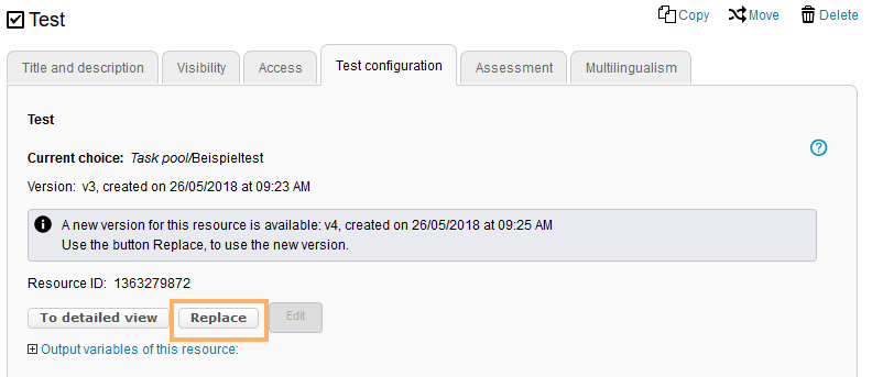 Klicken Sie auf den Button Austauschen, um die hinterlegte Test-Ressource durch eine andere Test-Ressource zu ersetzen. |